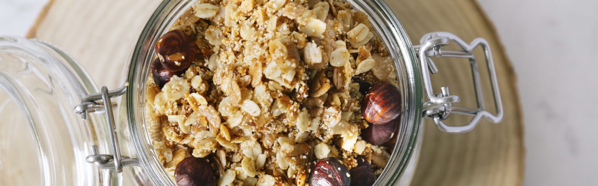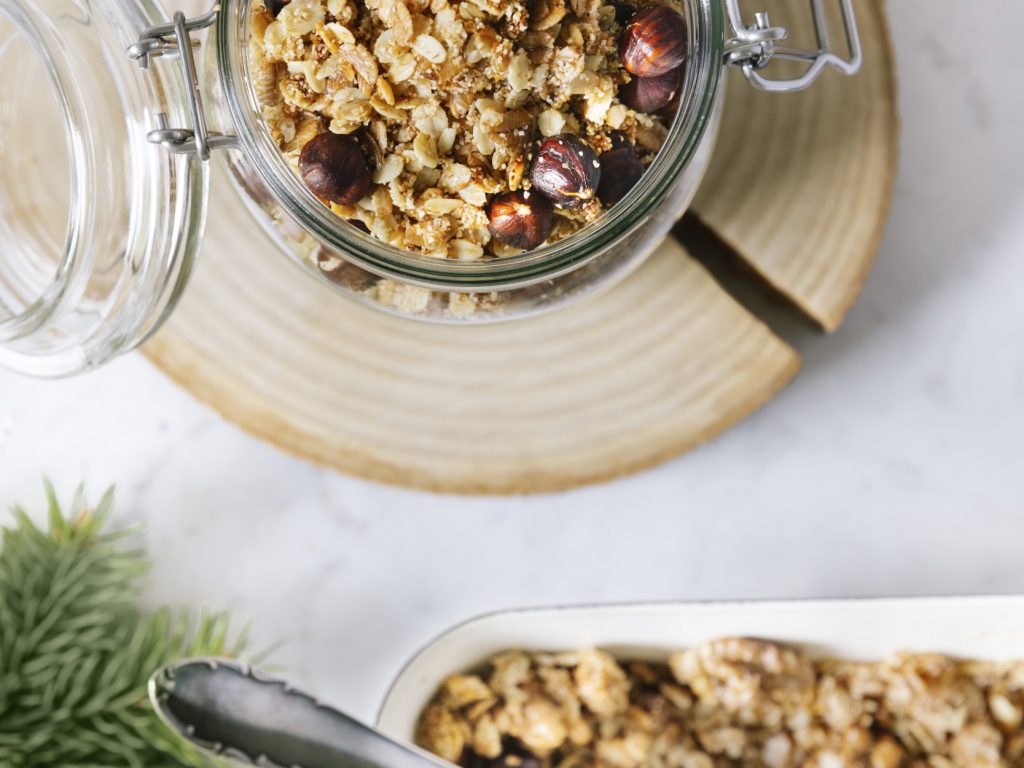 Leave the baked granola to cool, fill into a preserving jar and decorate with Christmas decorations. It will keep for several weeks if sealed.