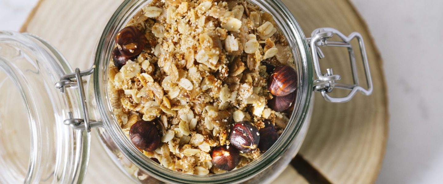 Place the Vorarlberg Riebel corn semolina, spelt flakes and rolled oats in a bowl and mix together. Add the forest honey and coconut oil and mix together. Press the mixture together a little with your hands to create small crispy pieces. Then mix in the nuts.