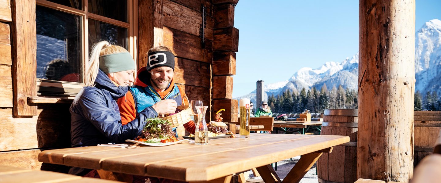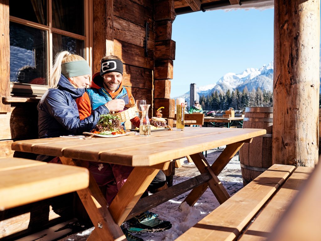 Eine Frau und ein Mann sitzen auf der Terrasse einer Berghütte, auf dem Tisch vor ihnen stehen Speisen und Getränke, im Hintergrund ein schneebedeckter Berg