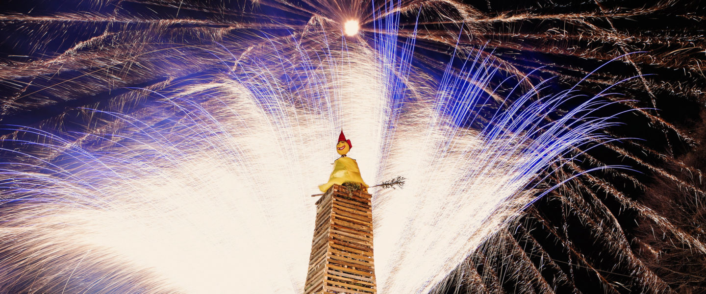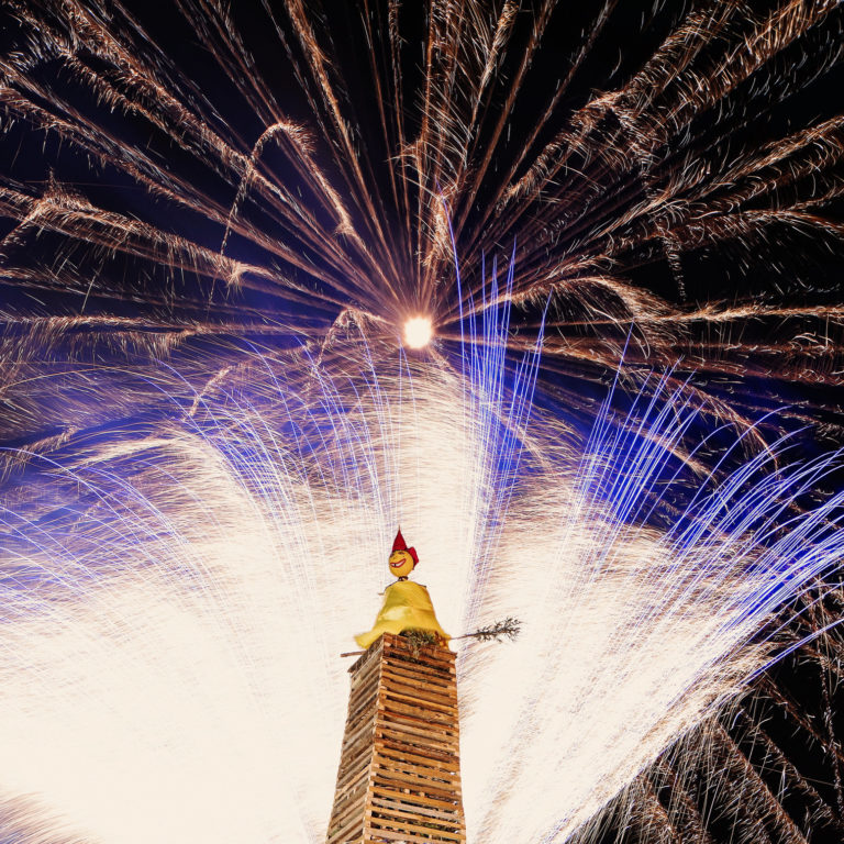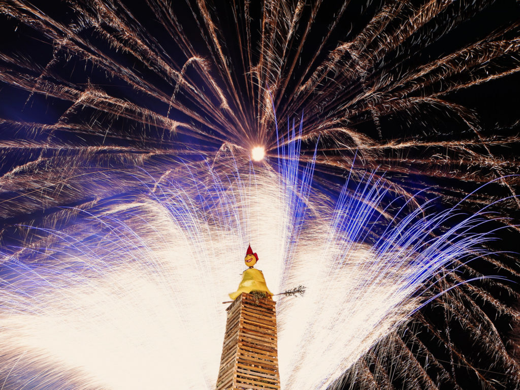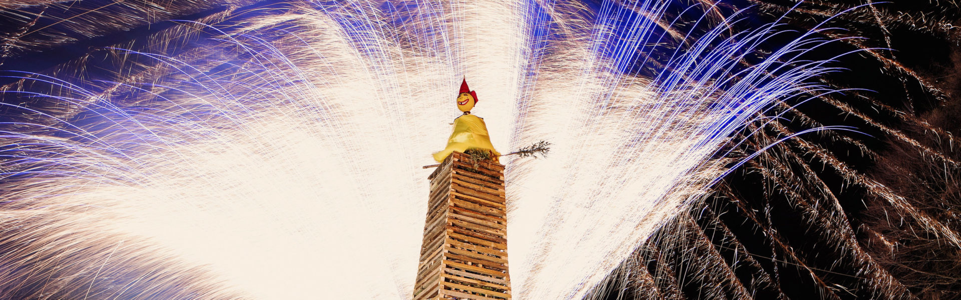For centuries, the Alemanni have been bringing carnival to an end with the custom of “Funken-Abbrennen” – a special ceremony to burn off bonfires that takes place on Saturday and Sunday (29 February and 1 March 2020) after Ash Wednesday. Therefore, Funken guilds all over Vorarlberg build looming bonfires – artful, polygonal constructions – to which they set fire in the evening in a festive ceremony. The highlight is the explosion of the powder filled witch, which is placed at the top of the wooden tower. The burning of the bonfire is accompanied by music, sometimes also fireworks, the traditional “Funkaküachle” eating which are made from yeast dough, and hot drinks. Ever since the beginning, this custom has always been supposed to dispel winter and the ferocious spirits of Carnival.