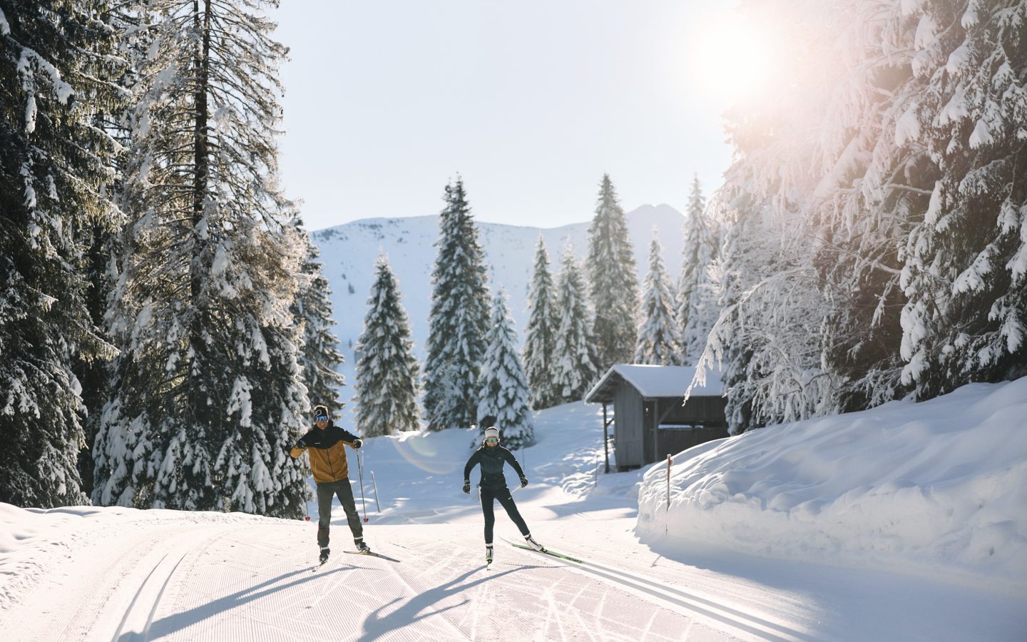 A diverse network of trails and routes for classic cross-country skiing and skating is available in all regions of Vorarlberg. Cross-country ski trails are present in numerous places. Many of these are even floodlit and open in the evening. High-elevation cross-country ski trails above 1,000 metres elevation are a special experience. Vorarlberg’s highest cross-country ski trail, across the frozen Silvretta lake to the Silvretta-Bielerhöhe at 2,000 m in Montafon, is an extra special experience. The Nordic Sports Park in Sulzberg is a compact option for winter holidaymakers far from the downhill ski slopes. There is even a 4-km floodlit stretch, which is open from Monday to Friday.