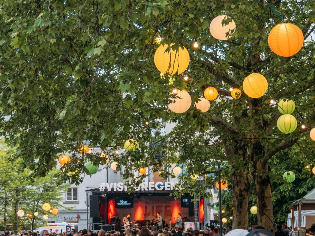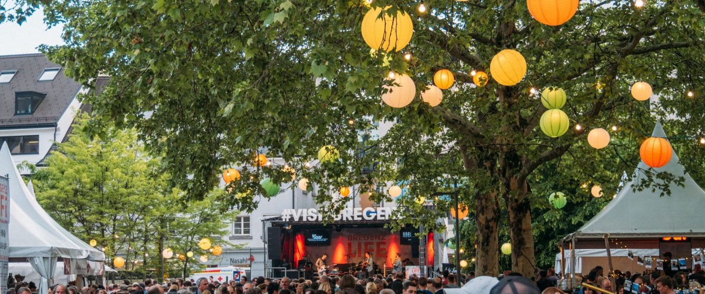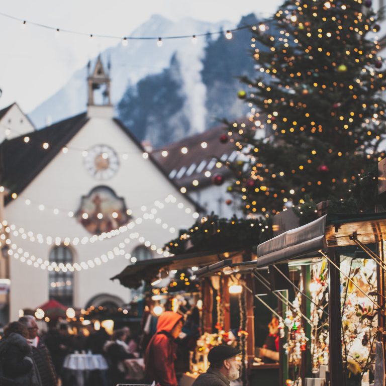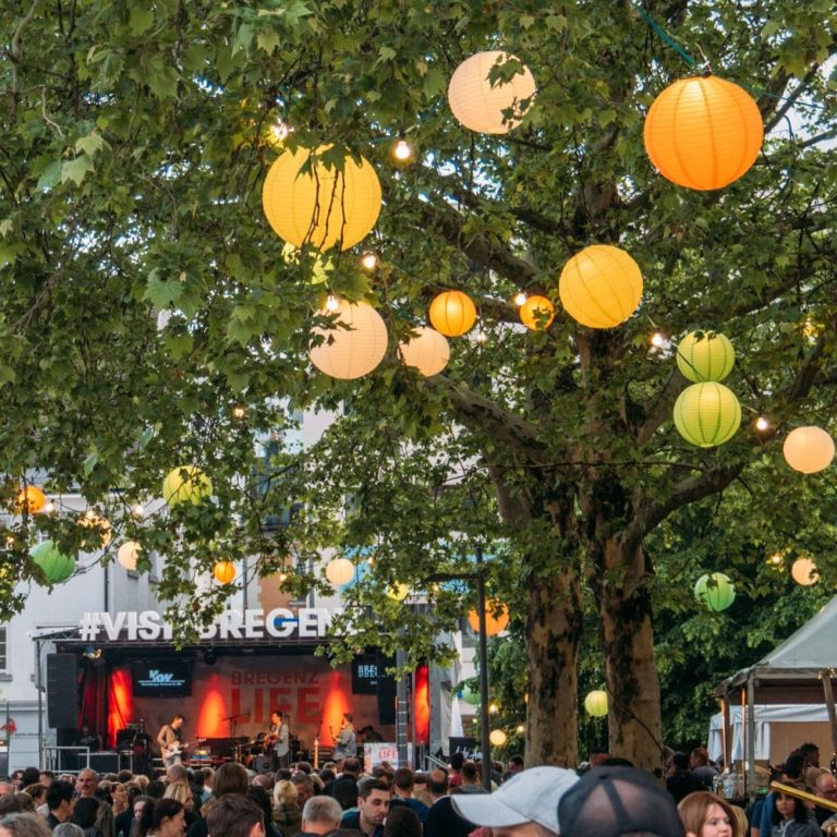 Christkindlmarkt am Marktplatz in Dornbirn, im Vordergrund ein großer Adventkrant, im Hintergrund Besucher:innen an beleuchteten Ständen