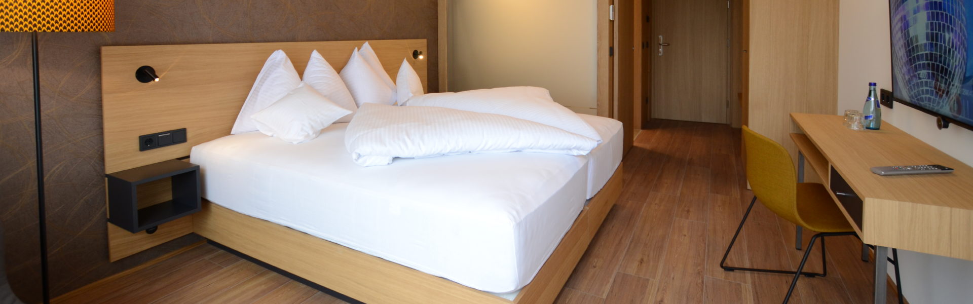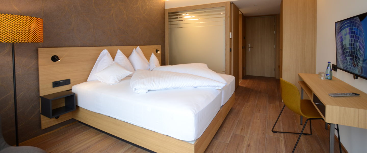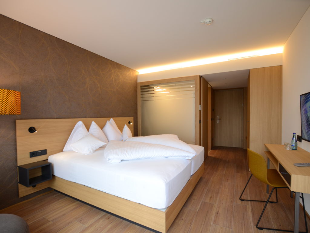 No wood is visible from the outside because the architects desired a more urban feel. The developers solved this task with an all-encompassing facade made from aluminium panels, which extended from the floor to the flat roof. The first time that one encounters wooden surfaces is in the rooms, which appear straightforward and warm. All rooms are non-smoking, barrier-free and are comfortably equipped with box-spring beds and contemporary technical infrastructure (LOEWE flat-screen TV, satellite connection, free internet access throughout hotel, laptop safe, & free Wi-Fi).