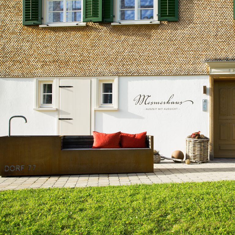 Nostalgia, romance and modern design can exist in harmony. For proof, look no further than the thoroughly renovated Mesmerhaus, which is dramatically situated in Bildstein. The village of Bildstein is located on a sunny mountain range high above Vorarlberg’s Rhine valley between the cities of Bregenz and Dornbirn. Bildstein, with its baroque pilgrimage church, is one of the most beautiful vantage points in all of Vorarlberg. It boasts great views of Lake Constance, the Swiss Alps and the Bregenzerwald region.