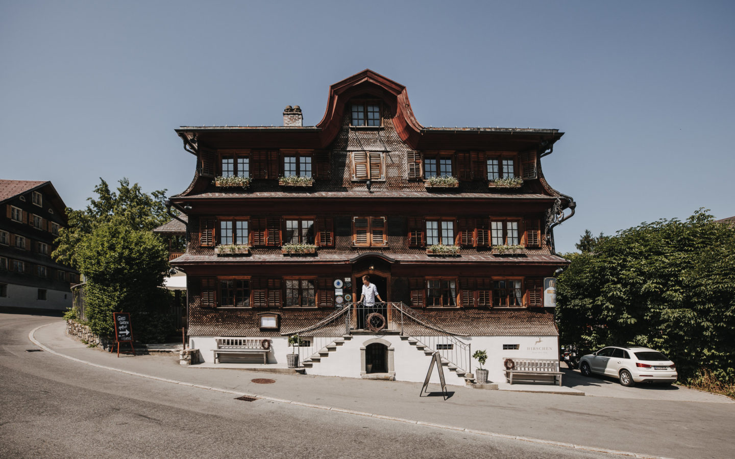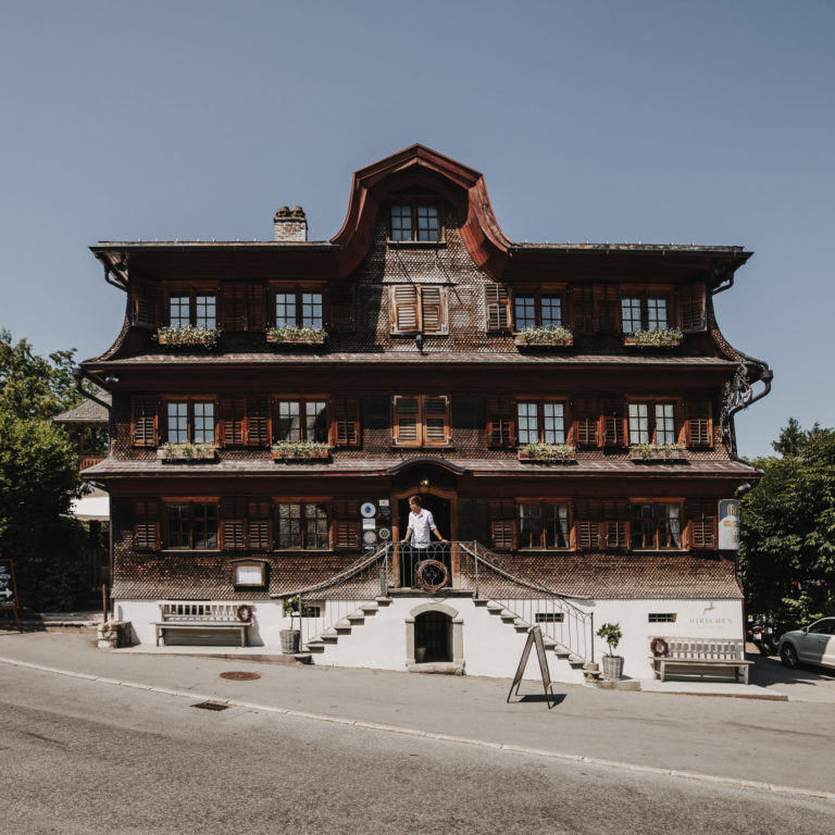 The way to the guest areas takes us up the stairs, along the narrow passage to the parlour immediately beside the main entrance of the ‘Hirschen’. As anyone who ever stayed here knows, the cosy atmosphere makes it a wonderful place to relax and treat yourself. Jonathan Burger takes a seat on a corner bench and reflects on developments in the culinary world. “I don’t follow trends,” he explains, “but I am taking an increasingly minimalist approach. In recent years, I think there were generally too many components on the plate. We have to prepare menus, sometimes for small groups and sometimes for one hundred or more people. Reducing our focus means that there is little left over, everything gets used up.” He and his team create their own recipes. He sums up his approach as follows: “I haven’t looked at cookbooks in months, that is the most important thing I have learned. It inspires me to be more creative. I have been reading more specialist literature, for example on preserving and fermenting.” Of course the menu also contains traditional dishes like Schnitzel, Kässpätzle (cheese spaetzle) and Riebel (corn semolina mash). “It’s not all about creativity. ‘Hirschen’ is a traditional establishment, where guests can enjoy Spaetzle, or boiled beef and a schnapps in winter after skiing. That is our mission.”