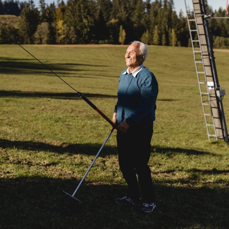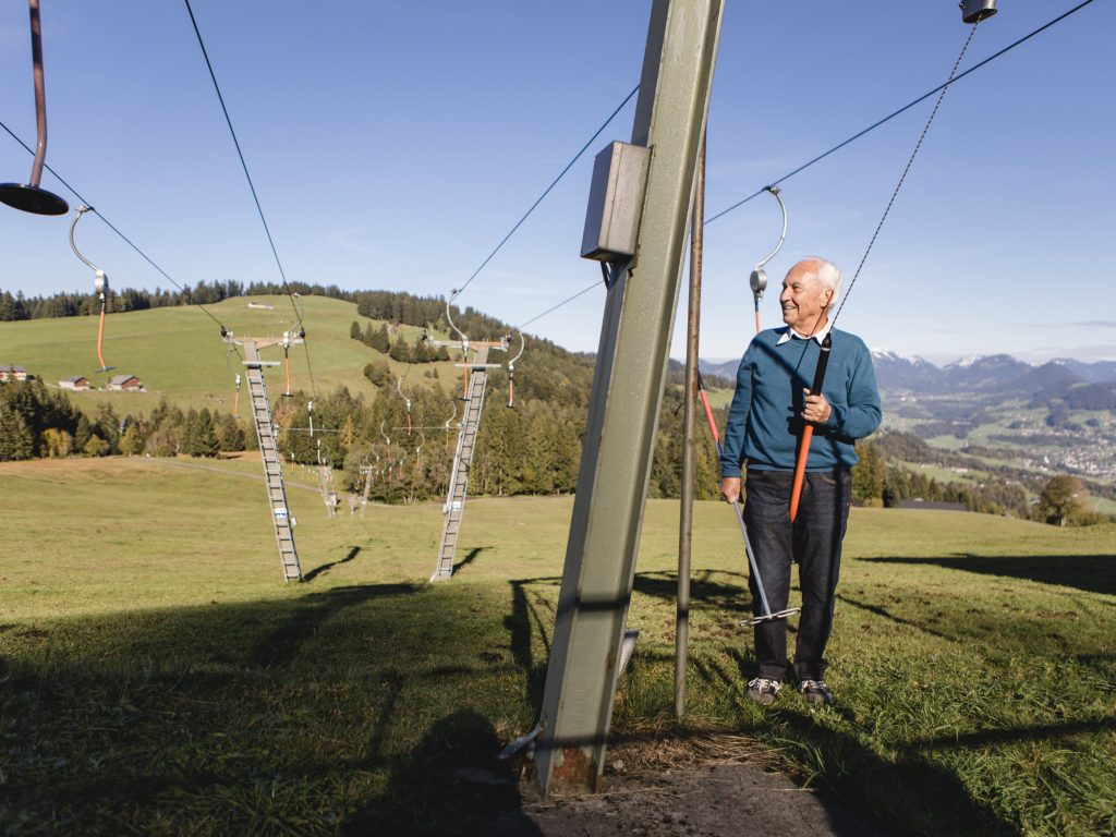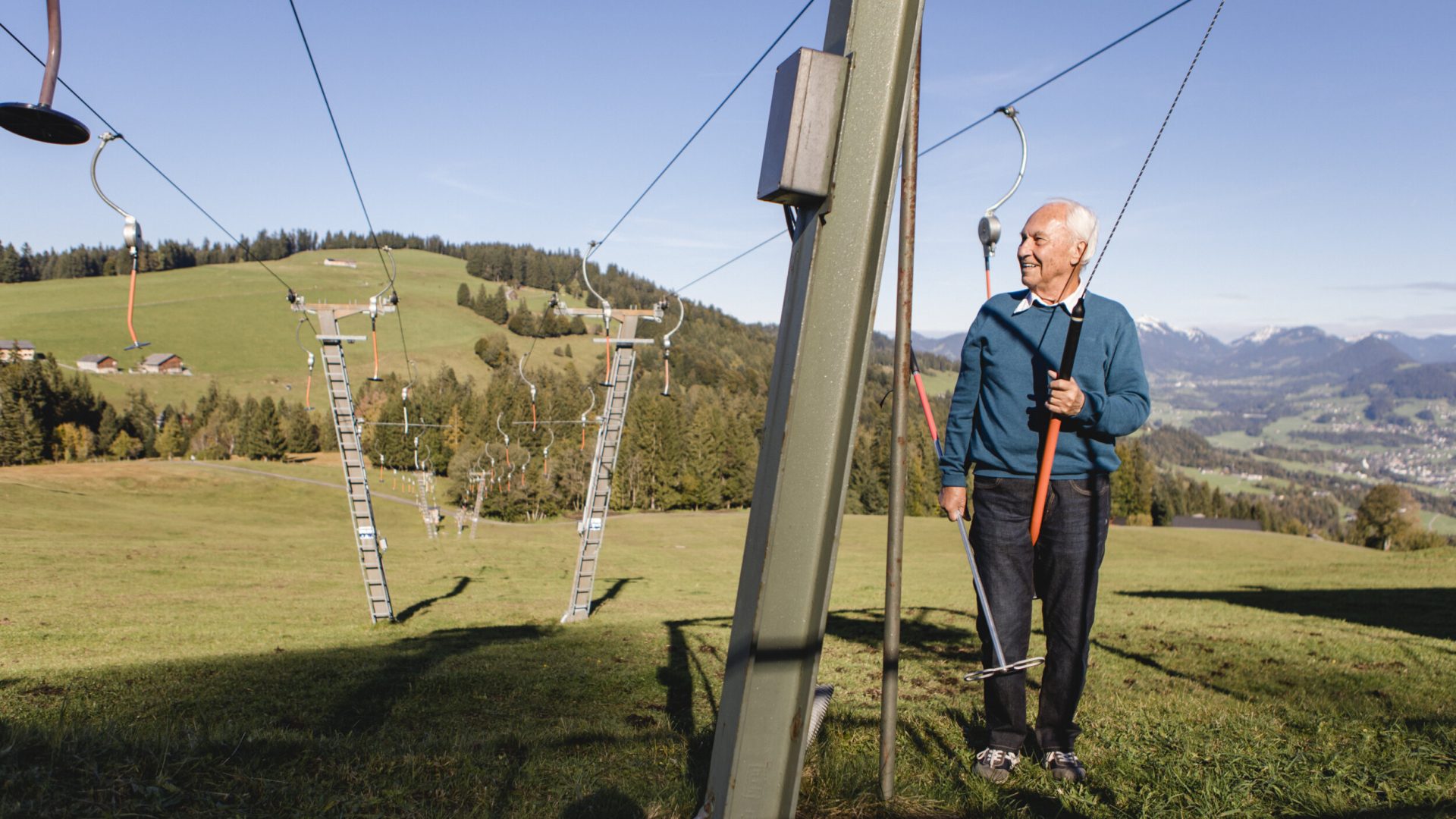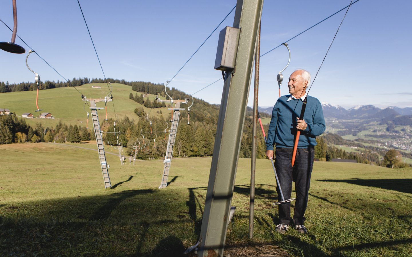 With a superb tan and a broad smile, he pretends to make a grab for the ski lift’s platter handle as if he were about to parallel-swing his way down the slope. But he’s wearing normal shoes and is standing in the middle of a green meadow, the autumn sun is shining and the mountains in the background are looking as if they’ve just been given a light dusting of icing sugar. The over-80-year-old expertly poses for the photographer while pointing out the benefits of the beginners’ slope with sweeping gestures. “Slight incline, no bumps and you can see everything!” The Weißtanne-Lift is located on the Bödele directly below the Schwarzenberg ski school – the first ski school to open in Vorarlberg. And it was Lothar Fetz who opened it – that was in 1979. But that’s not the only reason why he’s regarded as a skiing pioneer.