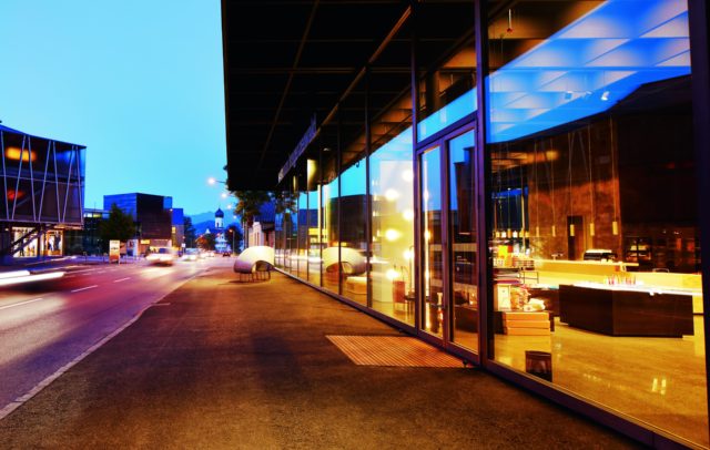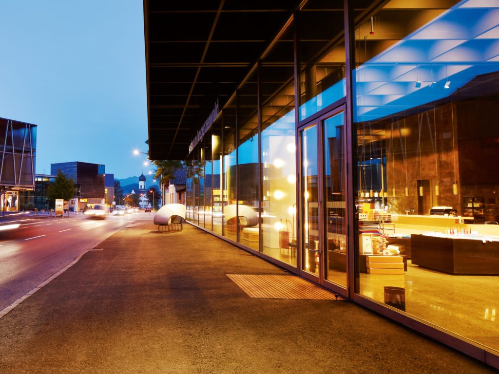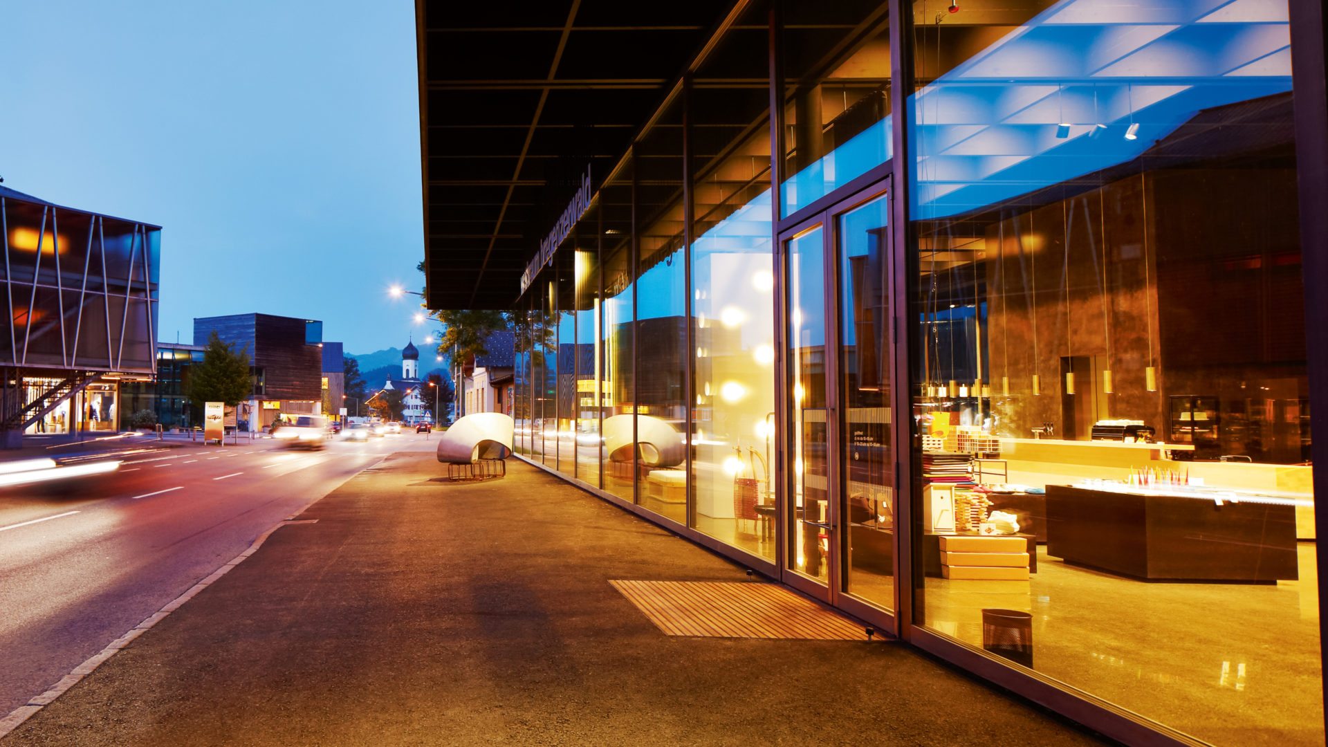 A slight squealing noise can often be heard coming from the main road that takes drivers through Andelsbuch. From the cars, usually driven by people just passing through, that suddenly start slowing down – not because there’s a speed trap but because of the architecture! A minimalist glass structure with a generous dark and overhanging wooden roof, designed by the renowned Swiss architect Peter Zumthor, was built by the tradespeople of the region right in the centre of the village in 2013. The landscape appears to literally flow through the Werkraumhaus’ glass façade which is so extraordinary and inviting that visitors just have to stop and take a seat at one of the wooden tables located in the comfortable interior or, on a warm day, outside in the shade under the overhanging roof.