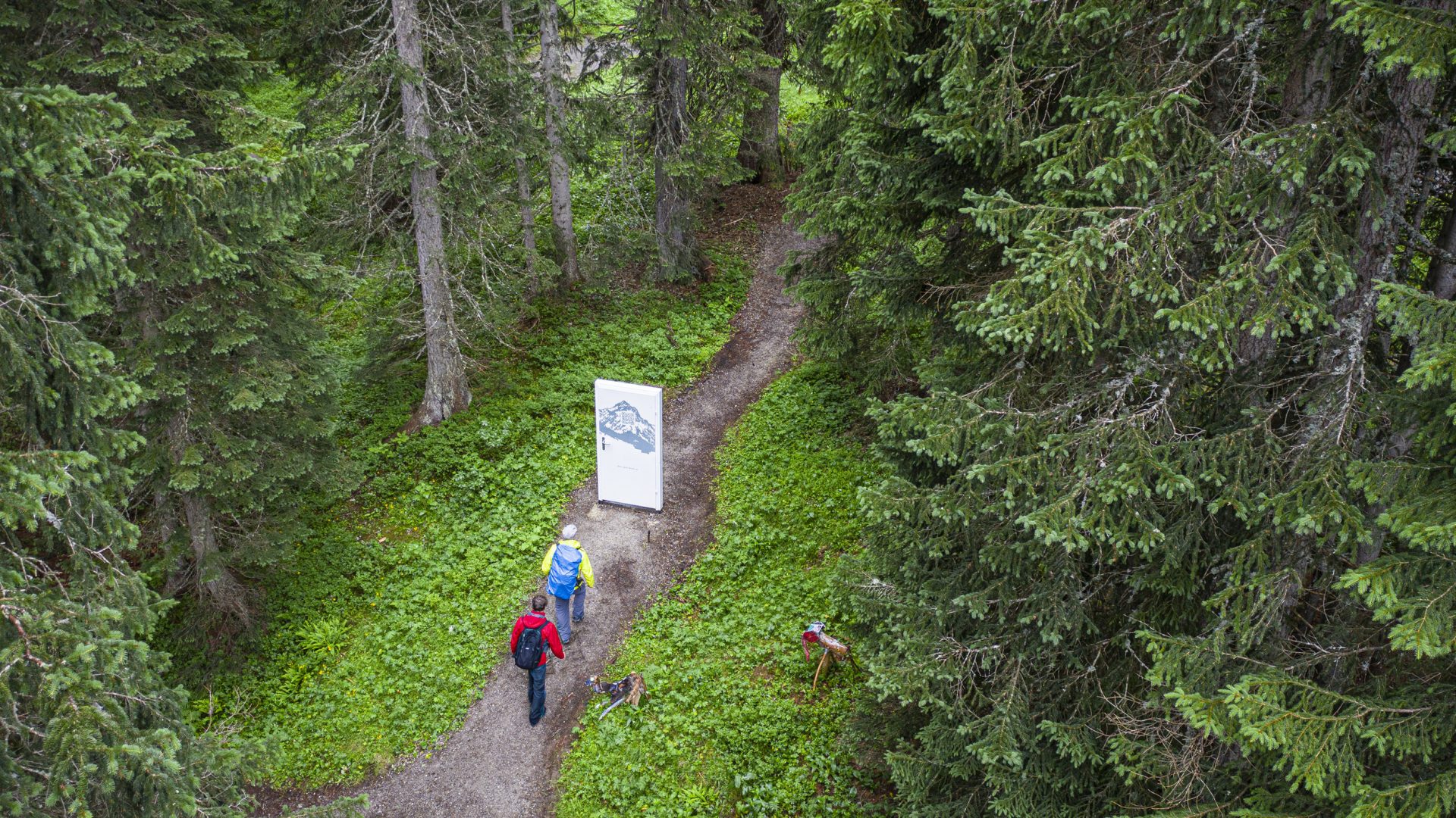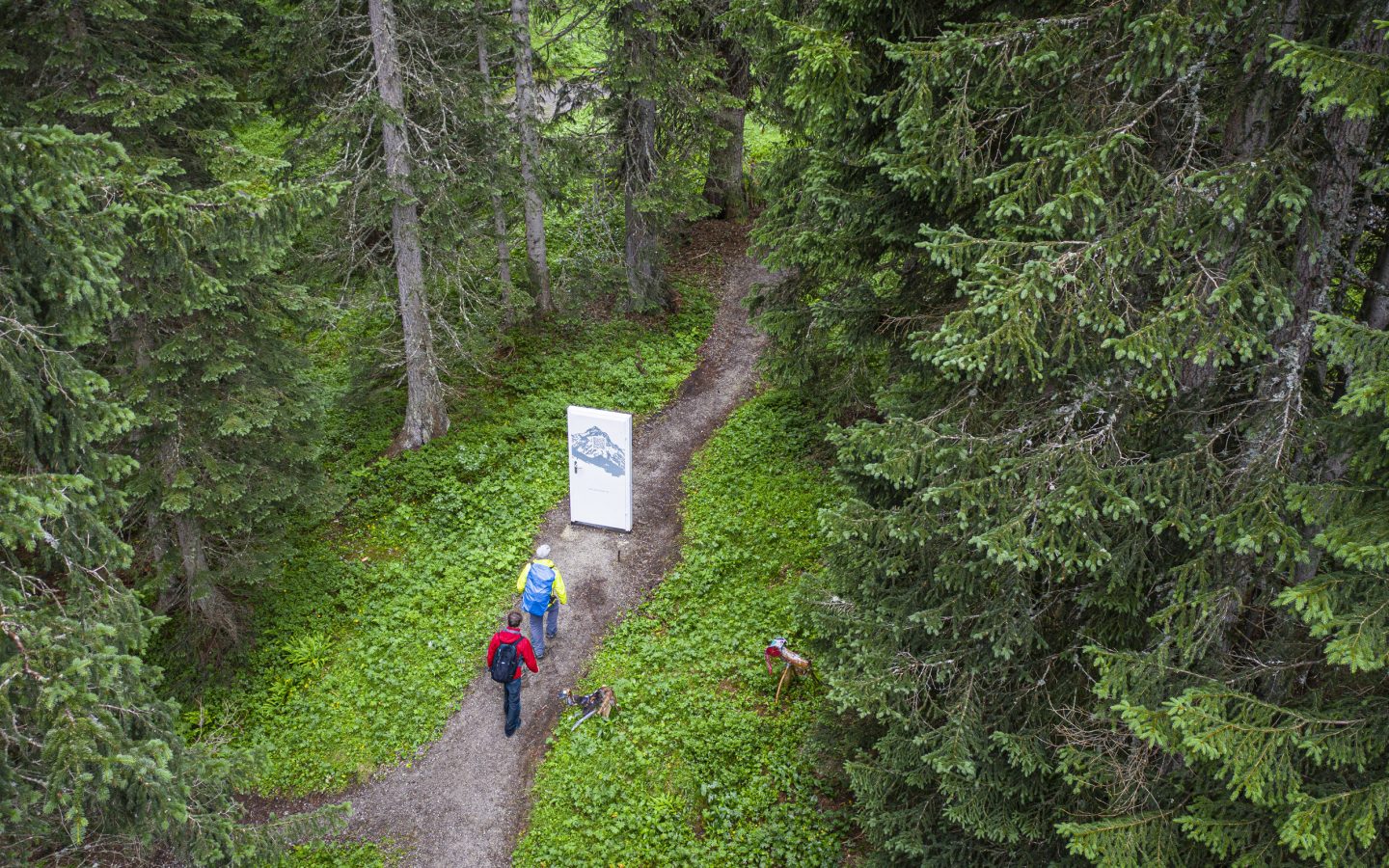 „Da oben“, der Grüne Ring: Das ist ein Wanderweg, der in 2.000 Meter Höhe rund um Lech am Arlberg verläuft und seit einigen Jahren neben den spektakulären 180-Grad-Panoramen auch Begegnungen mit der Kunst ermöglicht. Die Bregenzer Schriftstellerin Daniela Egger hat eine komplette Sagenwelt für die Strecke erfunden, Daniel Nikolaus Kocher die passenden Skulpturen dazu angefertigt. Dazu kamen nach und nach u. a. eine Hüttenbibliothek (in der jeder die passende Lektüre für eine Wanderpause findet) sowie eine Installation an der Europäischen Wasserscheide (an der man sehen kann, wie das Wasser auf der einen Seite Richtung Nordsee fließt und auf der anderen in Richtung Schwarzes Meer). Gleich hinter der Bergstation der Petersbodenbahn sind auf den Steinen der sechzig Meter langen „Lecher Mauer“ die Namen aller Ortsbewohner archiviert, gewissermaßen als ehernes, unvergängliches Pendant zur digitalen Datenspeicherung unten im Tal. Und ein paar Schritte weiter steht dann ein Briefkasten mit Postkarten, die Urlauber an Ort und Stelle schreiben und einwerfen können. Die Lech Zürs Tourismus GmbH kümmert sich zum Ende der Wandersaison ums Porto: „Entleerung jährlich 16 Uhr“.