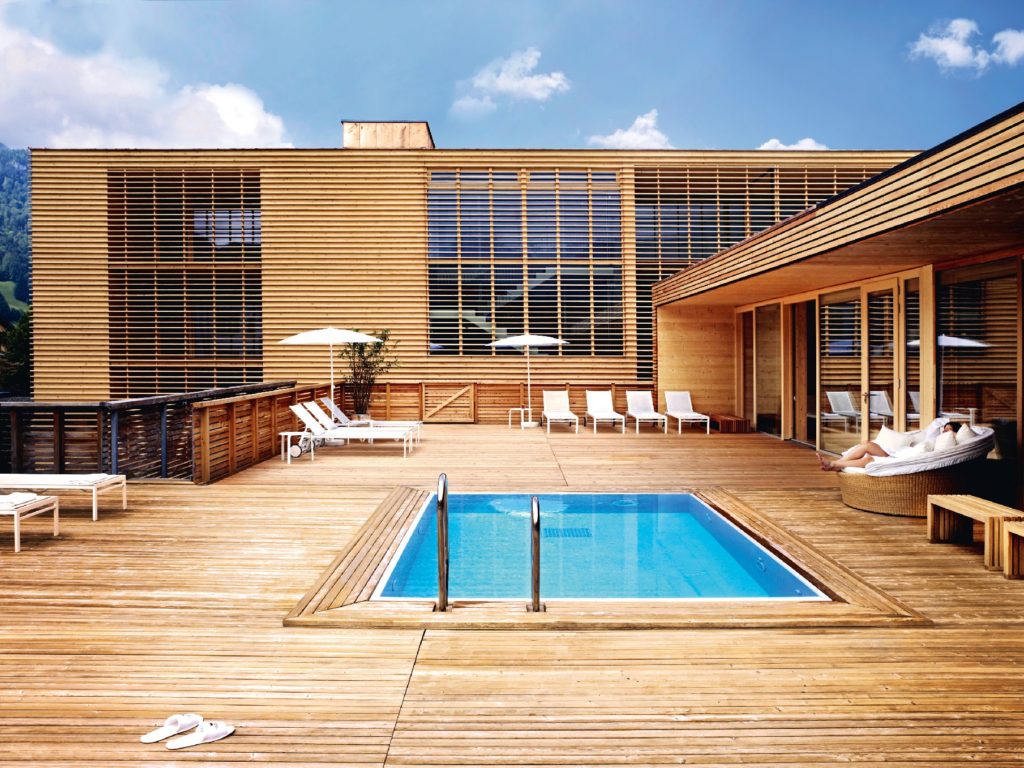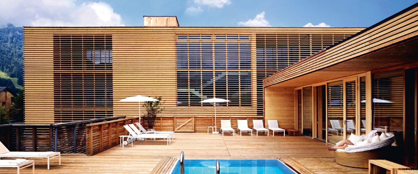 Der Hotelzubau wurde in Modulbauweise realisiert. Für dieses flexible System erhielten die Architekten 1997 den Vorarlberger Holzbaupreis.