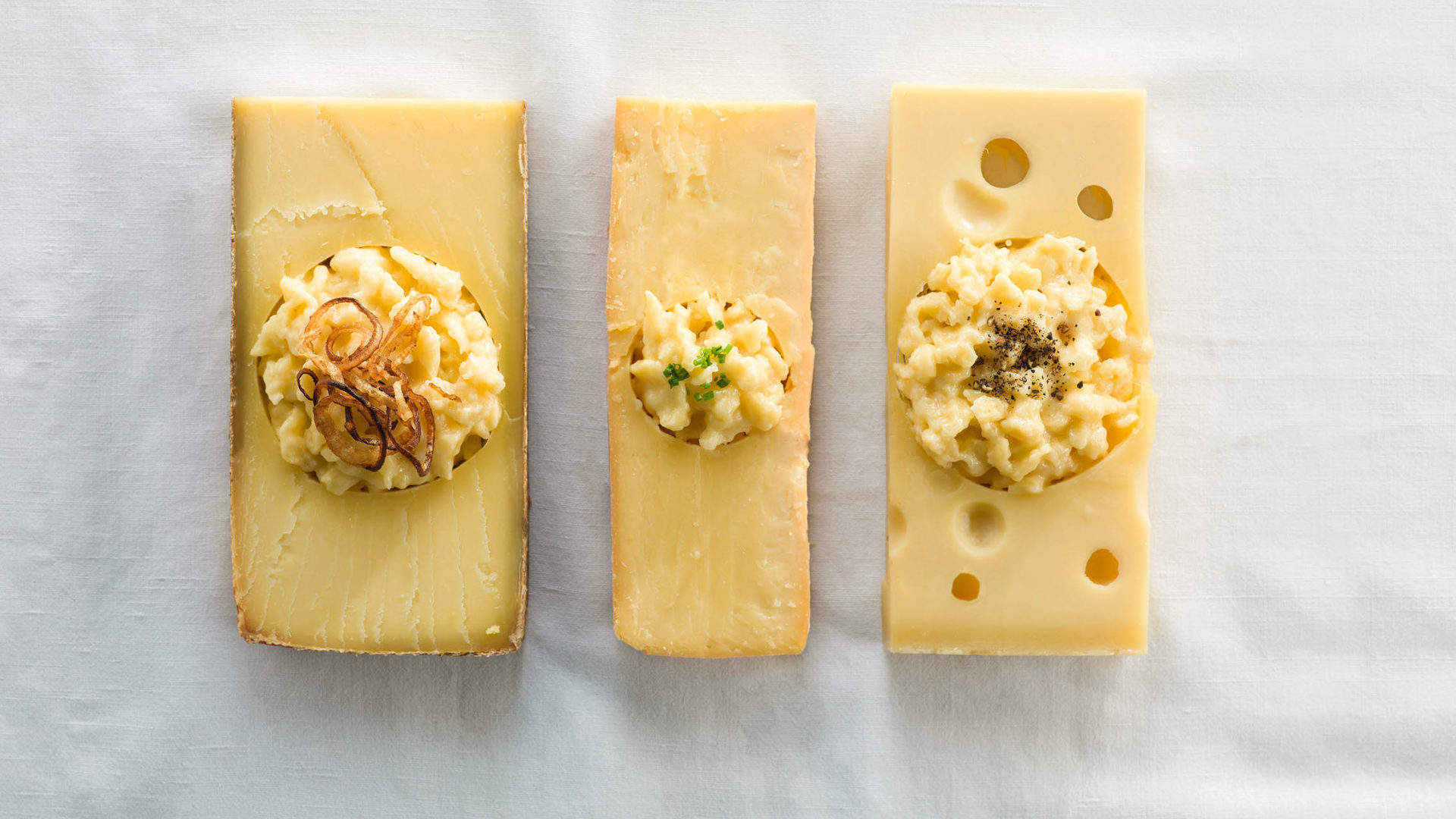 Die Käseherstellung hat in Vorarlberg eine lange Tradition – kein Wunder also, dass Kässpätzle hier besonders gut schmecken. Der dickflüssige Teig besteht aus Eiern, Wasser, griffigem Mehl und Salz.
