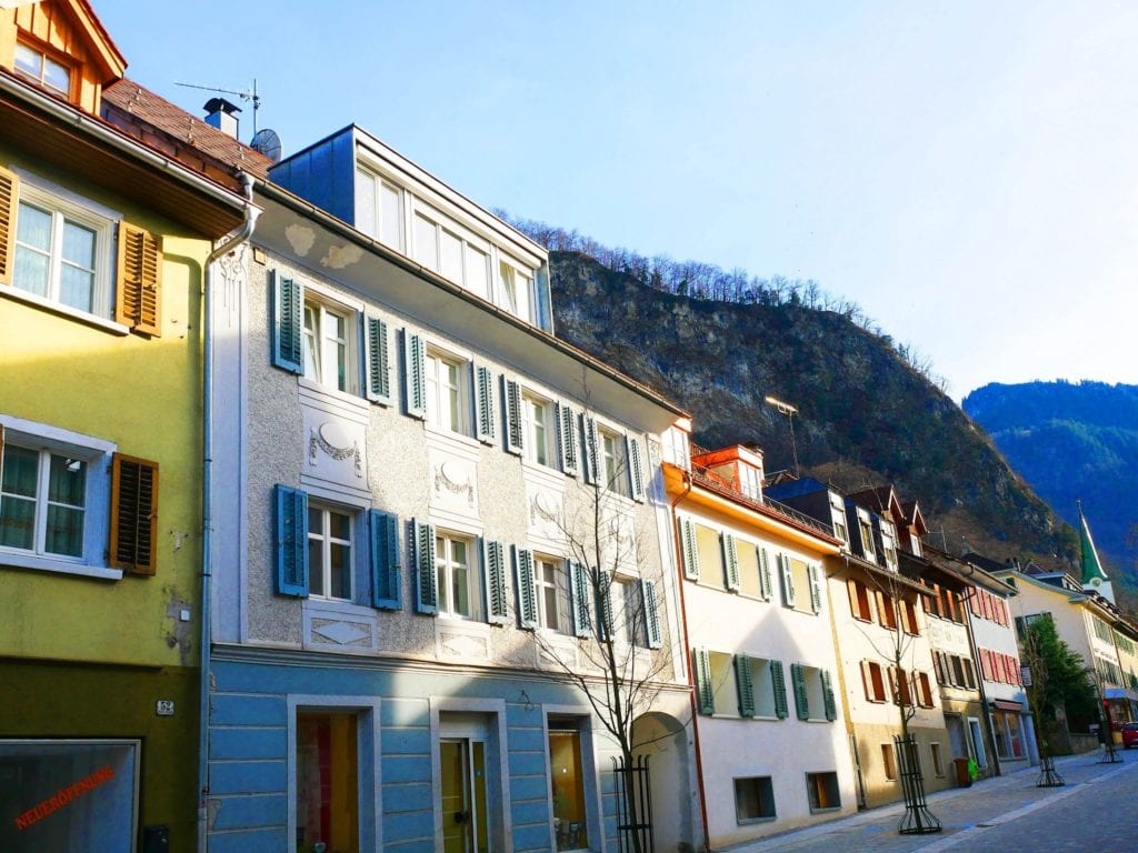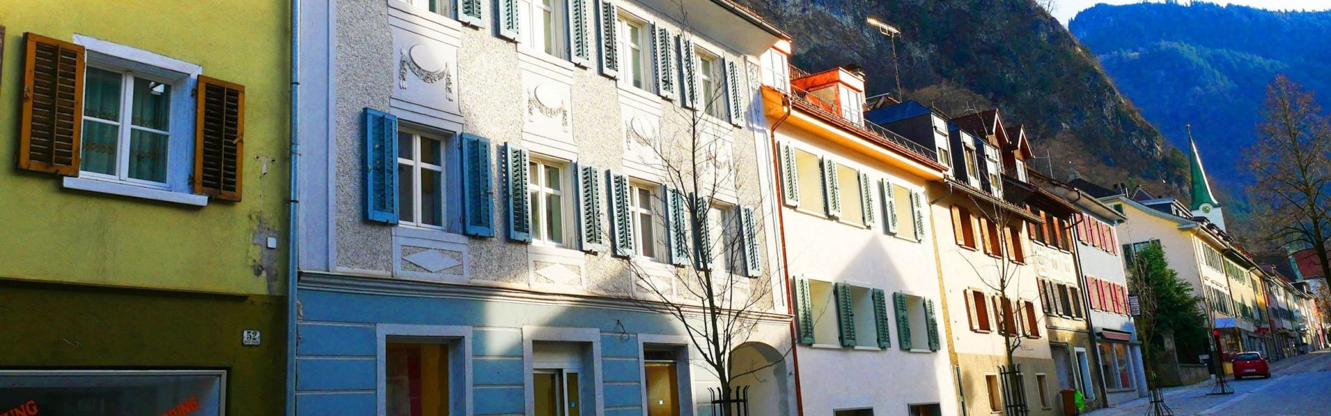 Blick auf die Häuserzeile in der Neuen Marktstraße im Stadtzentrum, ein Kulturweg in Hohenems