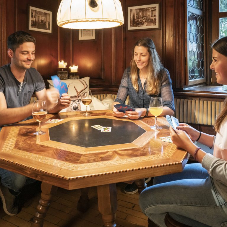 100 Arbeitsstunden kommen leicht zu-sammen, bis die kunstvollen Einlege-arbeiten abgeschlossen sind. Und dann hält der Tisch – nicht nur ein Leben lang, sondern auch das der nächsten und übernächsten Generation. Die meisten dieser Tische stehen bis heute bei Montafoner Familien, früher waren sie der zentrale Treffpunkt zum Essen, Kartenspielen, Beisammensein: „Auf der Schieferplatte in der Mitte kann man heiße Töpfe und Pfannen abstellen ohne Untersetzer, und beim Kartenspielen schreiben die Gäste mit Kreide den Spielstand drauf.“ Neben der Krone finden sich auch im Gasthaus Löwen im benachbarten Tschagguns noch Montafonertische. Hier „kon’d’Lüt zemma“, wie die Montafoner sagen.
