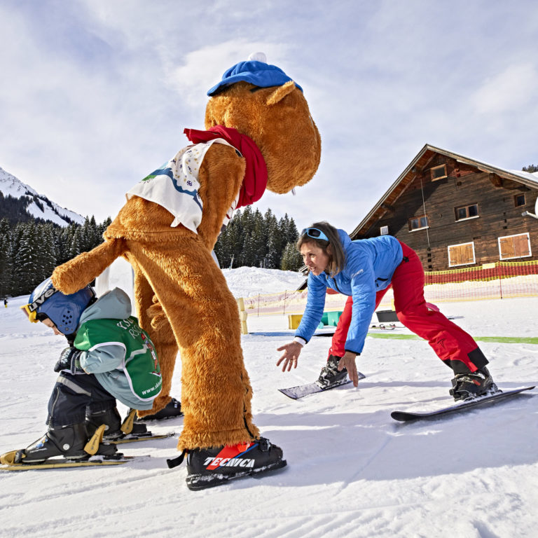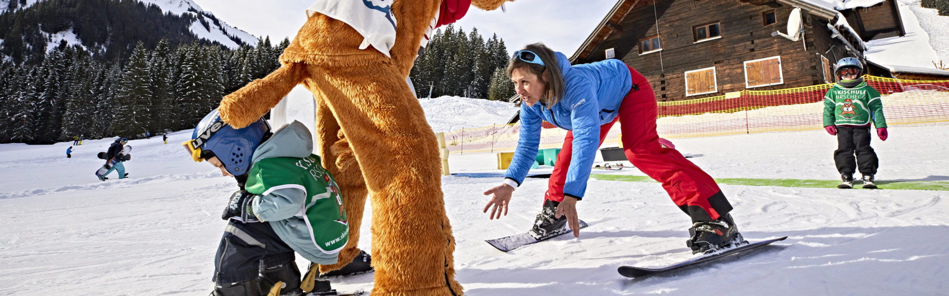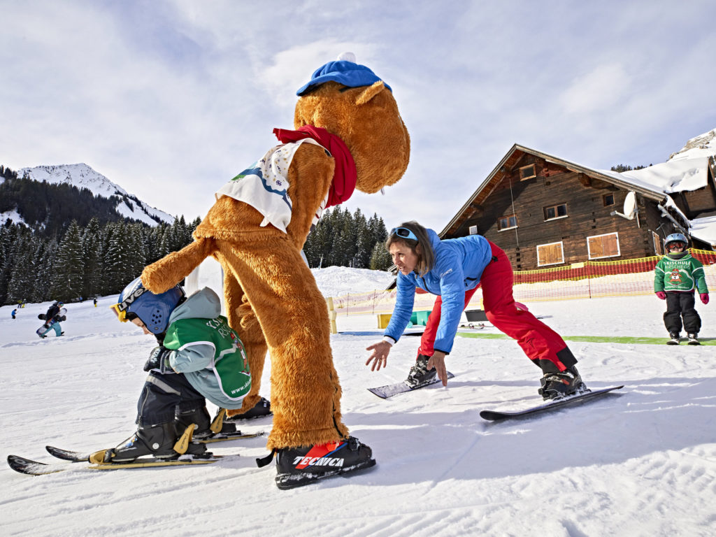 Alle Skischulen im Kleinwalsertal haben Bereiche für Kinder, ab drei Jahren geht es los. Maria Gobald unterrichtet am liebsten die absoluten Anfänger – die jetzt oben am Berg um sie herum stehen: dick verpackt, mit Helmen auf den Köpfen und Leibchen, auf denen das Maskottchen der Skischule zu sehen ist. „So wie das Murmeltier könnt ihr das auch gleich, nur noch viel besser!“ Die Kinder scheinen skeptisch. Maria geht in die Hocke, Augenhöhe ist wichtig. „Und heute Mittag gibt’s Spaghetti mit Tomatensauce!“ Jetzt strahlen alle.