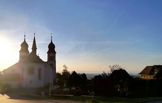 Wir treffen Wolfgang Hilbrand auf einer Bank an der Kirche von Mittelberg. Als Ausgangspunkt unserer Wanderung ist sie nicht zu verfehlen: Ihr 66 Meter hoch aufragender Turm ist das Wahrzeichen des Dorfs, ja für viele sogar des gesamten Kleinwalsertals. „Über 600 Jahre ist er alt und musste noch nie saniert werden“, sagt Wolfgang Hilbrand stolz. Fünf Walserfamilien kamen am Ende des 13. Jahrhunderts aus der Schweiz und wurden hier sesshaft. „Sie hatten keinen Stahl, kein Eisen, also machten sie die Mauern zweieinhalb bis drei Meter dick, damit St. Joduk für die Ewigkeit halten würde.“