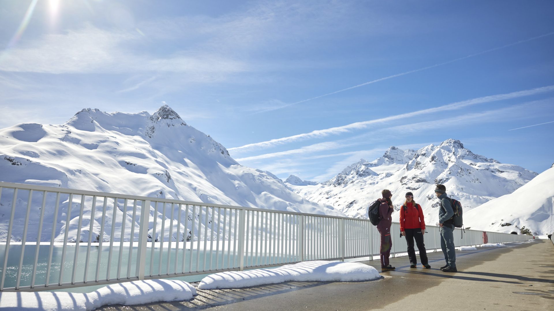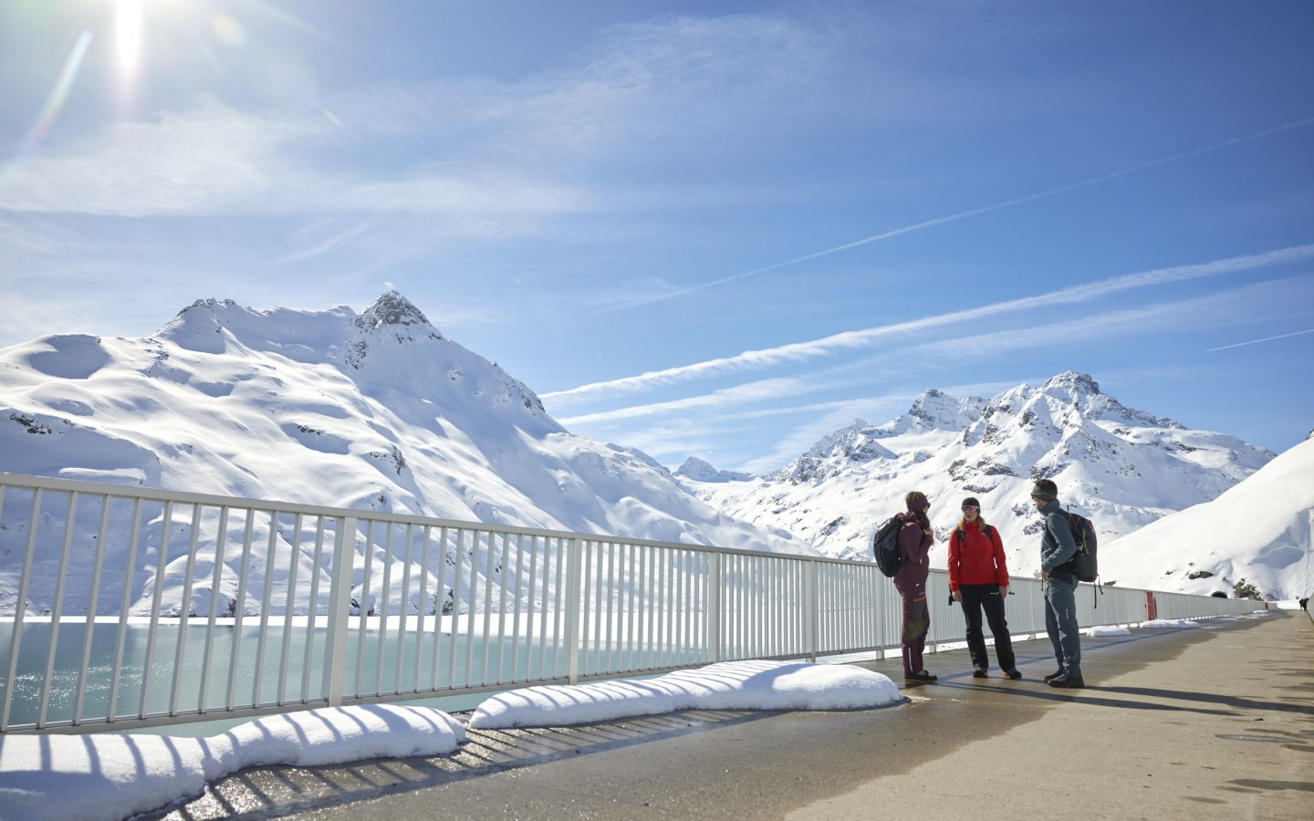 C Winterwanderer auf der Silvretta-Bielerhöhe, entlang des Silvretta Stausees